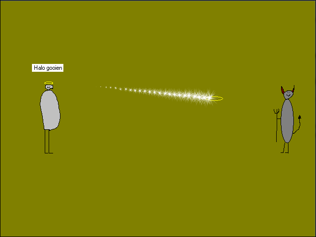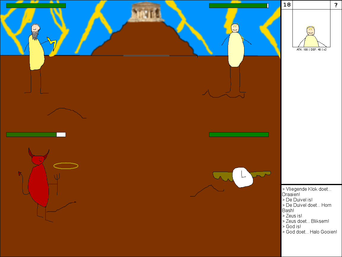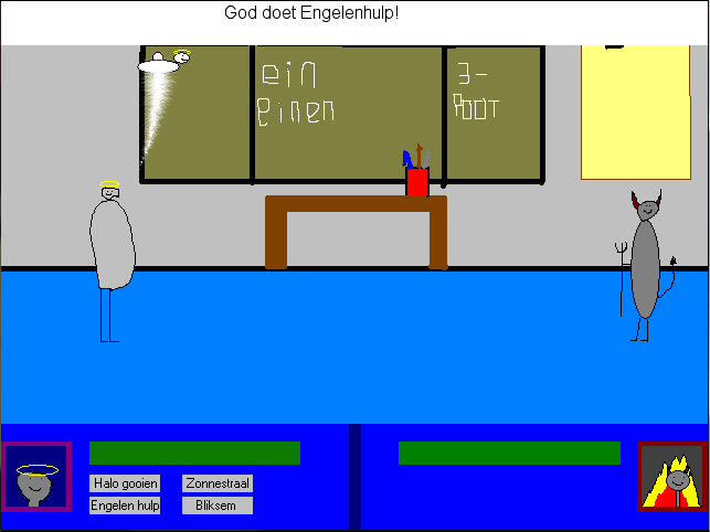 As for Epic Battle, ik heb meermaals een poging gedaan om het spel te implementeren. Dat begon in de derde klas van de middelbare school (2009-2010): een nobele poging, waarin het me lukte om God en de Duivel tegen elkaar te laten vechten. Enige probleem was dat God het enige personage was wat de speler kon kiezen en er maar ruimte was voor überhaupt één menselijke speler. Het spel uitbreiden met meerdere personages faalde jammerlijk door slecht programmeertechnisch ontwerp en het schip strandde: het was duidelijk nog te hoog gegrepen. Zie ook de screenshot hiernaast.